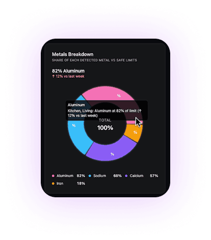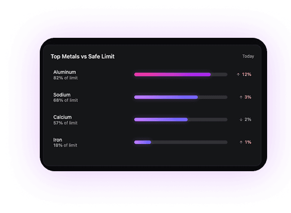 Individual metal readings were difficult to interpret in isolation. This view ranks detected metals by proximity to their safe limits, making relative risk immediately clear.