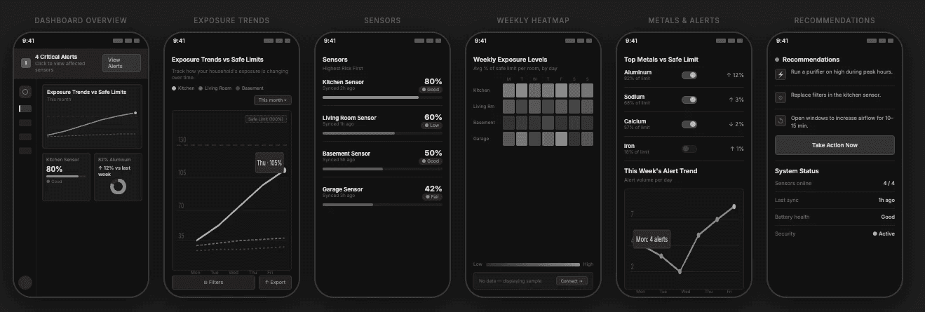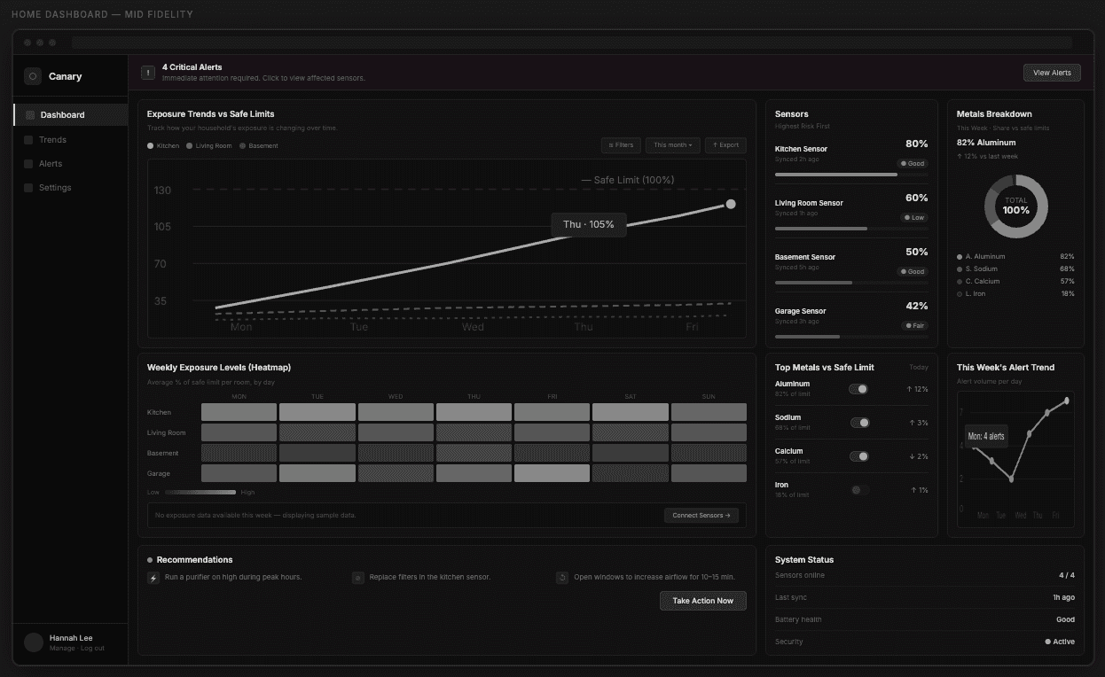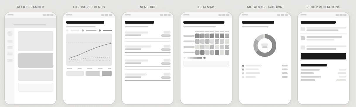 Designed a data dashboard that translated complex lab-generated air quality and metal exposure data into clear, actionable insights for non-technical users, enabling better understanding of risk and next steps.
