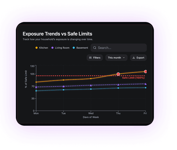 Raw values don’t communicate risk unless users can see how exposure changes over time and how close it is to unsafe thresholds. This view contextualizes sensor data by plotting trends directly against safe limits.