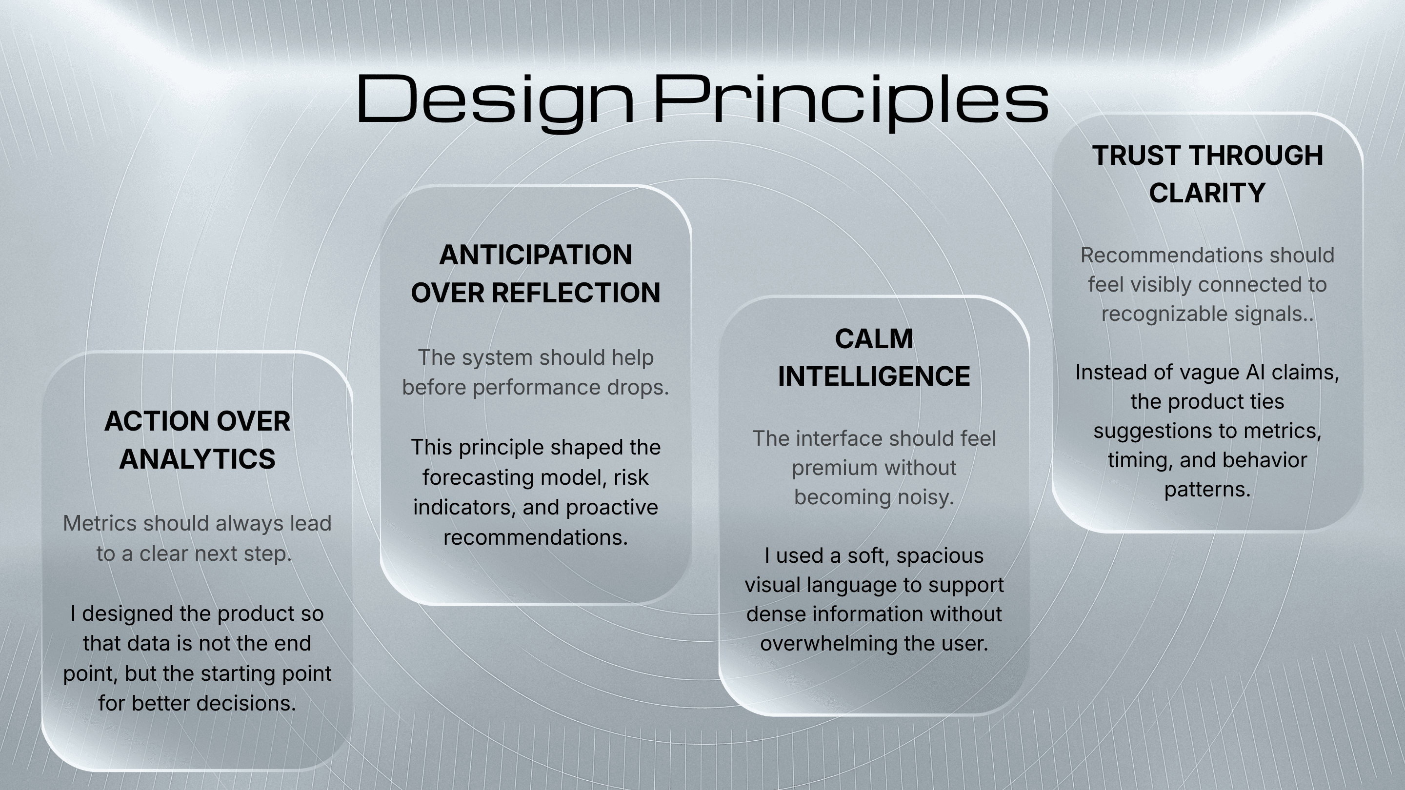 Working on FONRA taught me to think beyond isolated screens and instead design a connected product system. Each part of the experience needed to support a different decision horizon, from what is happening now to what patterns matter over time.