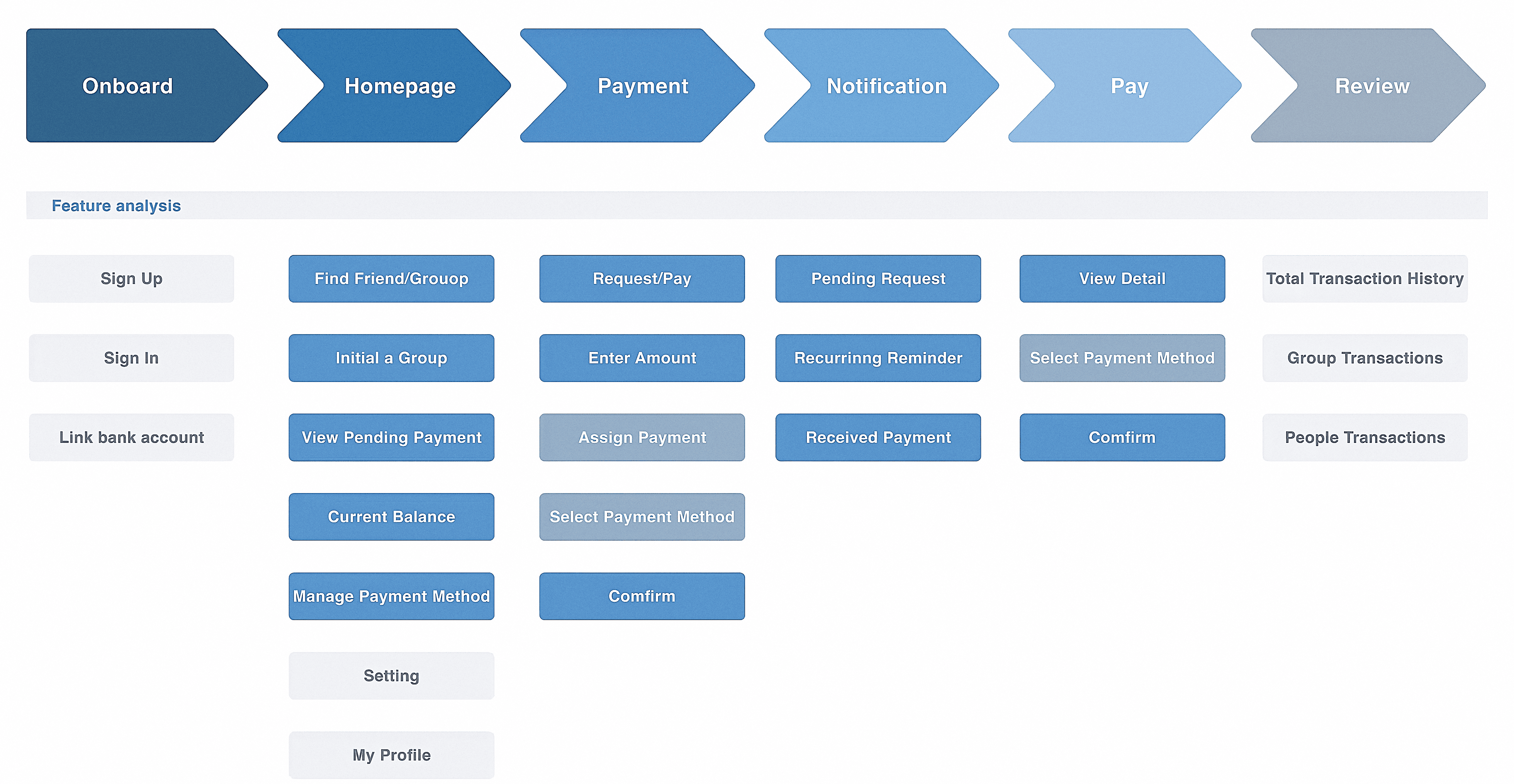 We color-coded the entire feature set across the six user journey stages — surfacing what was core, what was new, and what was carried over unchanged from the original app.