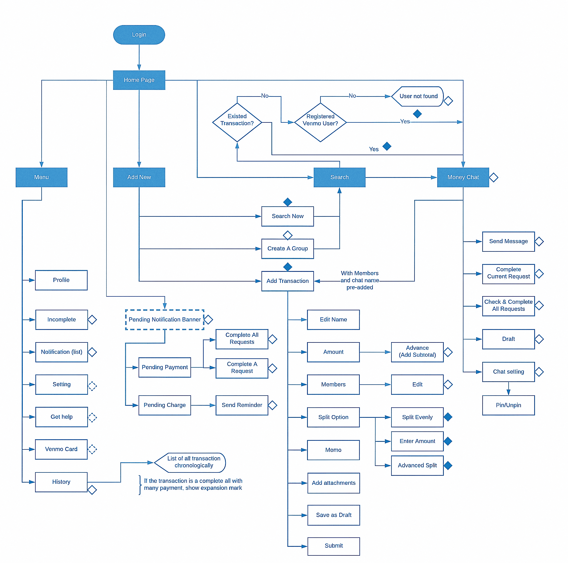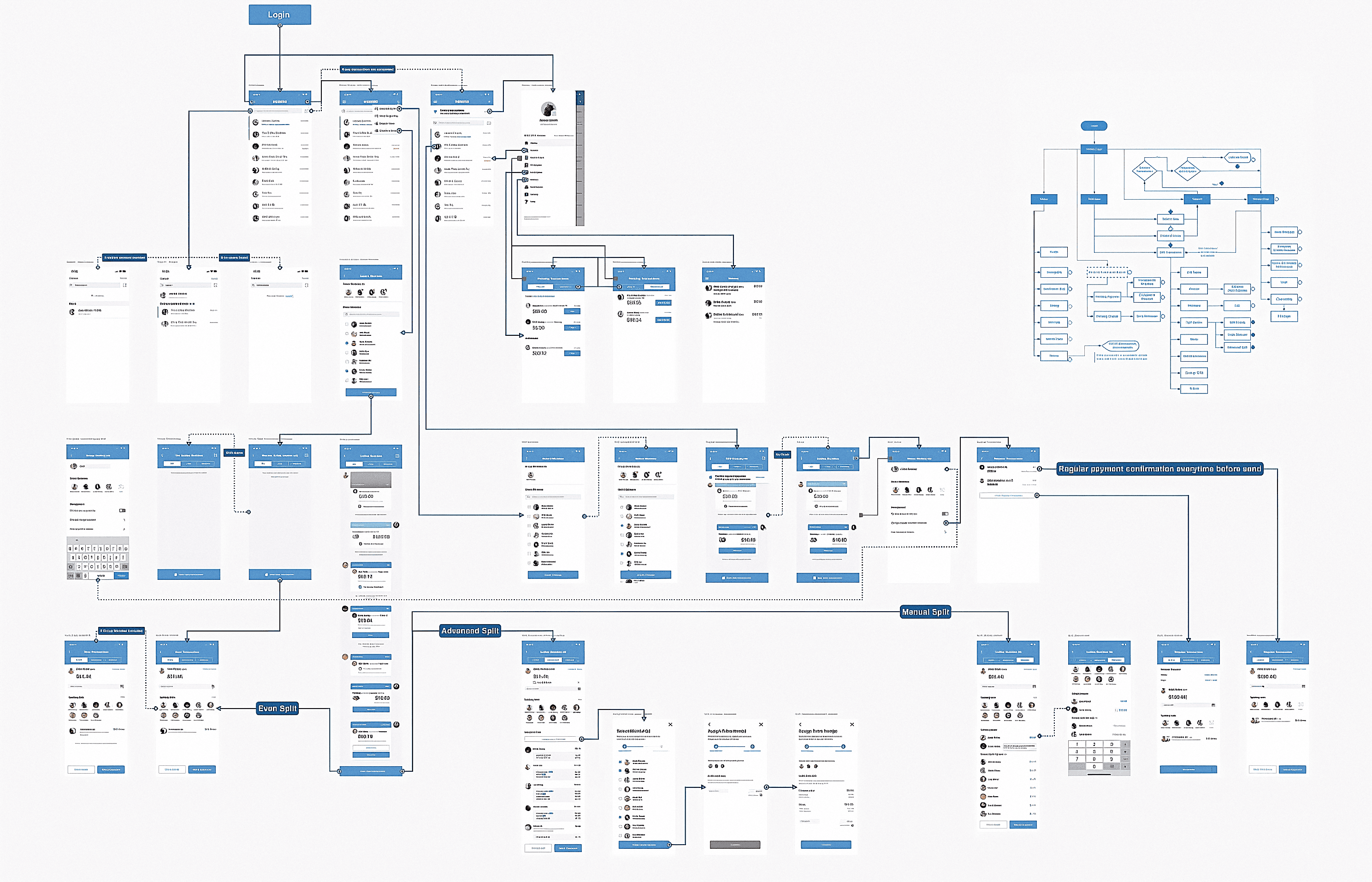 Before wireframing screens, we built a comprehensive decision-tree flowchart mapping every state, branching path, and error condition — from login all the way through transaction submission.